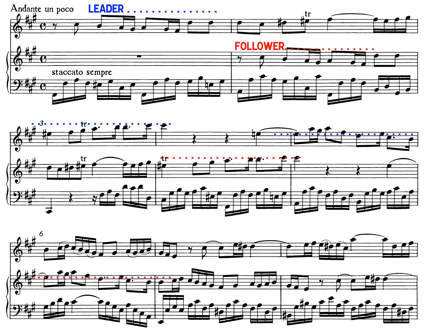 At the end of the episode, we explore the canon from the sonata in A Major for Violin and Harpsichord, BWV 1015. The third movement (in f# minor) is a strict canon from beginning to end. Check this out: