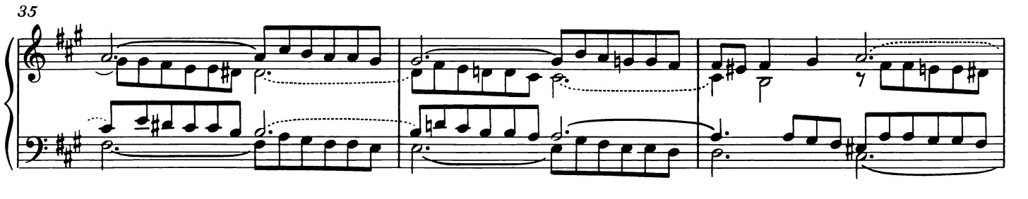 In any case, Kreuze was probably never far from Bach’s mind, and f# minor was usually a key for expressing pain and suffering in the cantatas. The fugue from Book One of The Well-Tempered Clavier, BWV 859 is full of blatant passion language, seen in the weeping of the countersubject: