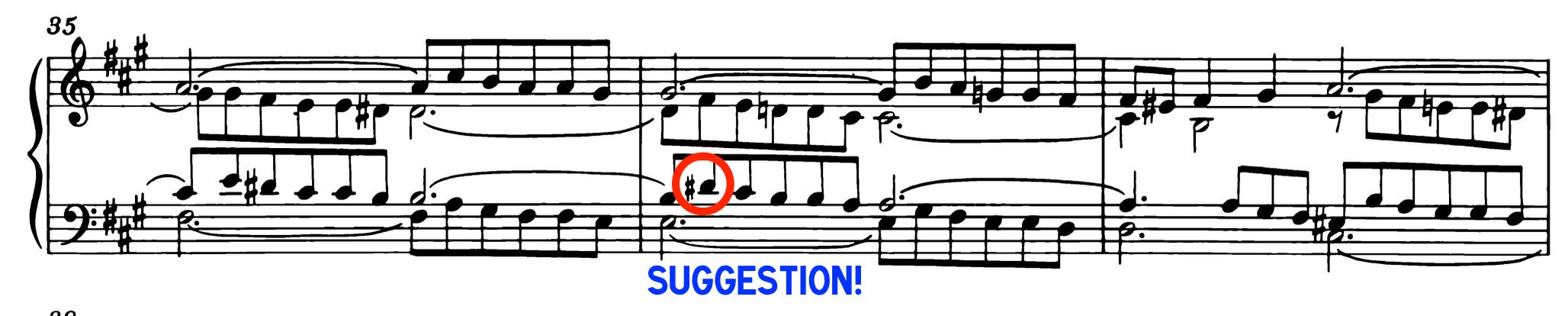 One question I have concerning modern editions is the tenor voice in bar 36. In the earliest version, Bach has given— as a cautionary accidental— D natural: