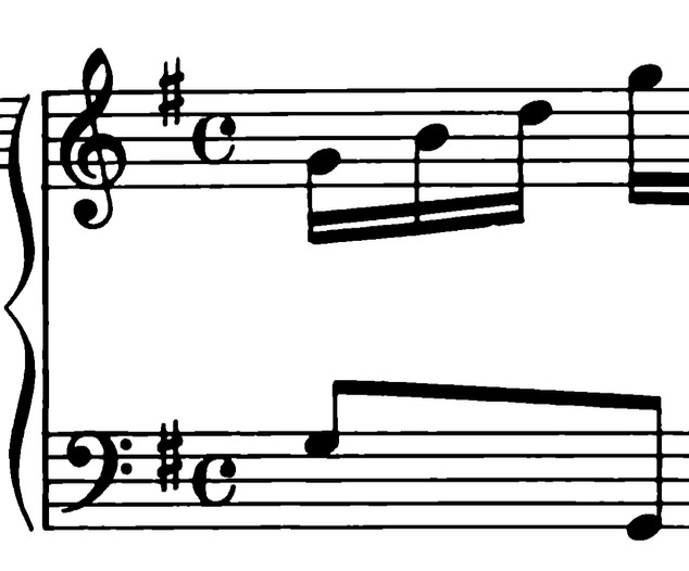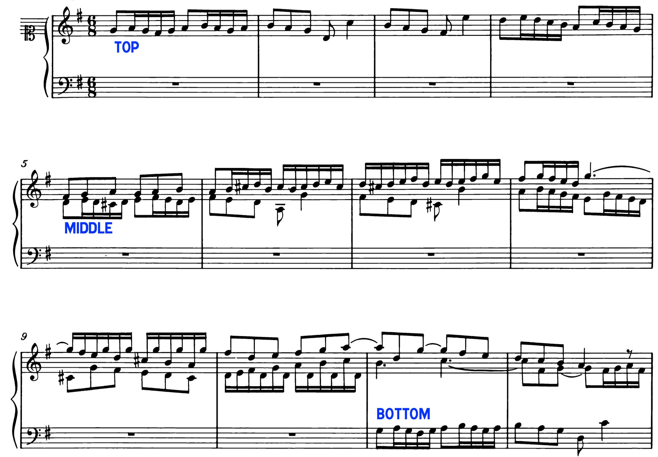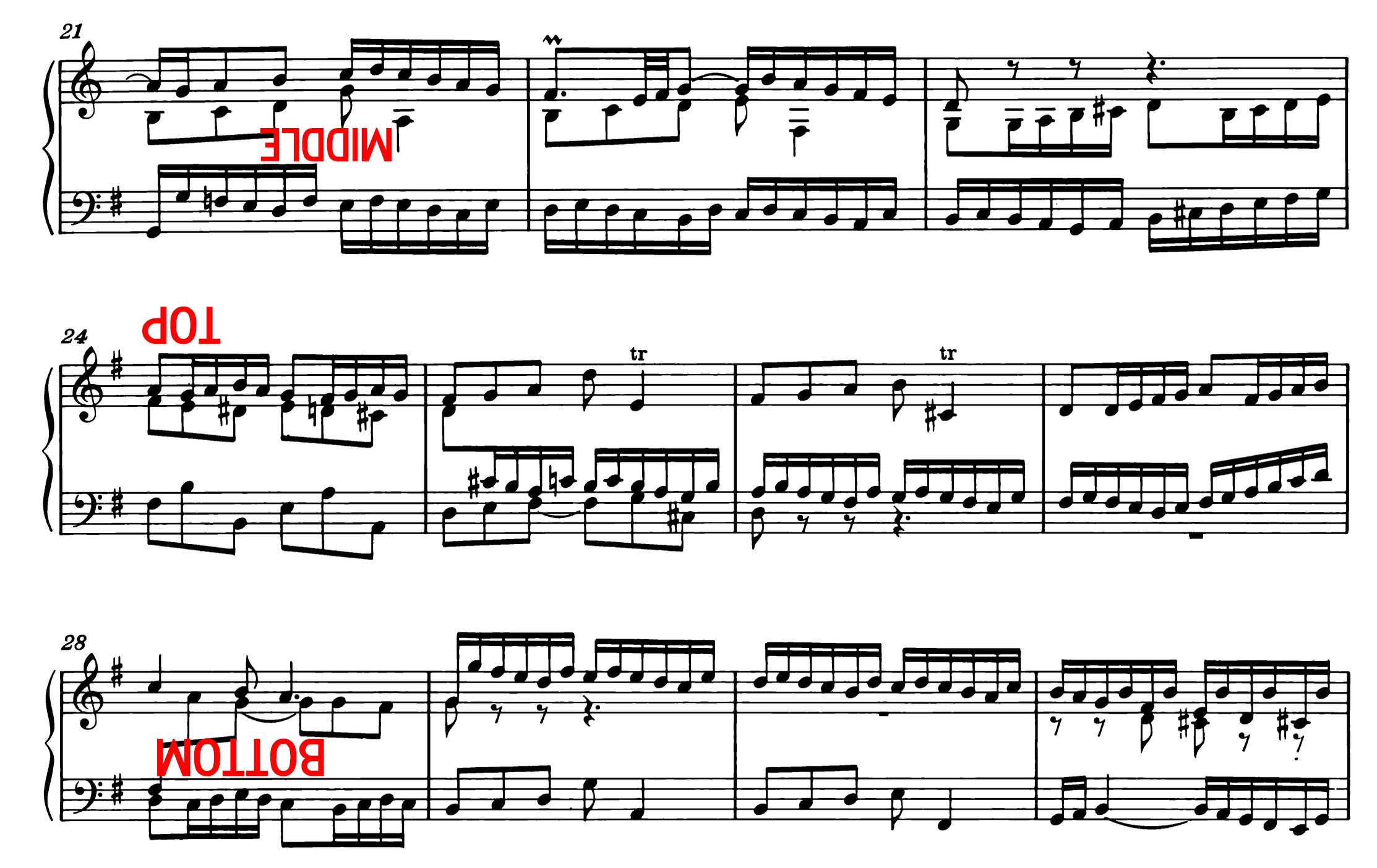 But after only a few bars, Bach is ready to bring in all the voices again— this time with the melodies upside down. (Inverted exposition.) N.B. The middle voice’s theme began on the previous page: