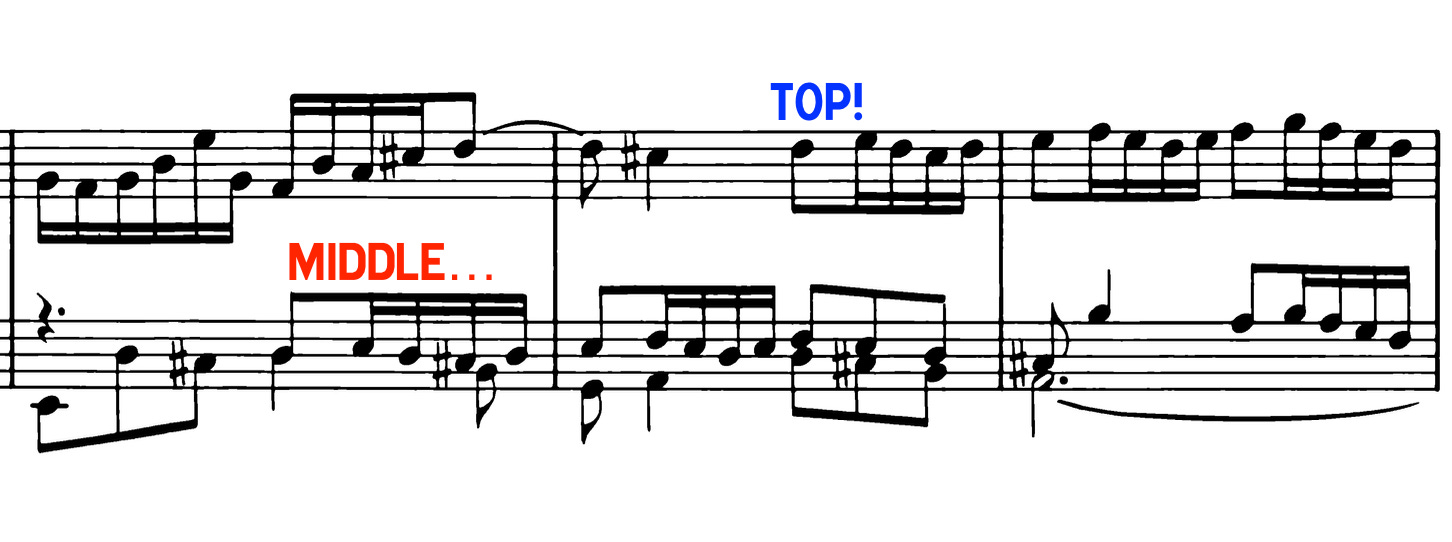 And there are stretti in this fugue, one melody interrupting another. Here’s one where the themes are rhythmically shifted to the second half of the bar: