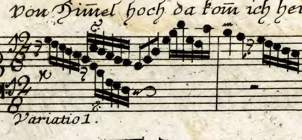 The subject of the last several episodes has been Bach’s canonic variations on a Christmas tune by Martin Luther himself. A major inquiry into this work is its existence in two versions: engraved and handwritten. The published version (for reasons explained in the episode) doesn’t fully solve the canonic lines, as seen here: